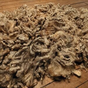 Beautiful fleece ready to be washed up and made into something amazing. This is a raw fleece so it does contain minimal vm as all raw fleeces contain some vm. These locks will wash up pure white and take dye extremely well, as this wool contains little to no Kemp.